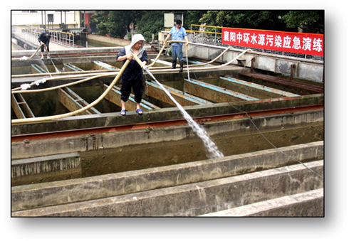 5月28日上午,襄陽(yáng)中環(huán)水務(wù)米公水廠開展了一場(chǎng)“水源污染應(yīng)急演練”?!把菥殹蓖ㄟ^該廠位“漢江取水口水源地突遭不明原因污染”,城市供水“被迫緊急停止” …… 。圖為演練過程中,米公水廠員工利用多支高壓水槍,對(duì)水廠“被污染水池池面、管道” 等進(jìn)行全面、徹底的清洗。“演練” 進(jìn)一步提高了企業(yè)員工處置突發(fā)事件的思想意識(shí)和能力。