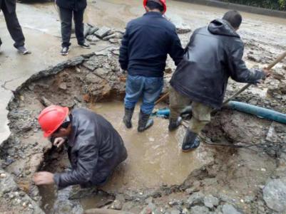 因爆管事件突發(fā),搶修人員趕到現(xiàn)場時,水泥路面已塌陷出一個大坑,馬路上到處是積水,天空還下著雨。為了盡快修好爆裂管道,在最短時間恢復供水,搶修人員不懼艱辛,不顧泥水和雨水的困擾,齊心協(xié)力、緊張有序地進行著漏點的搶修。經(jīng)過近4個小時的奮力搶修,終于完成了瑪麗醫(yī)院DN400PE管修復工作,保障了群眾正常用水。