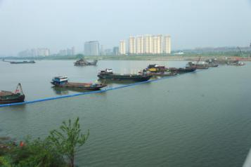 4月10日上午10點,13艘作業(yè)船分布在供水管道的各個吊點,開始進行注水沉管作業(yè)。為控制管道的水量流速,每注水一次10分鐘,暫停約15分鐘。施工方根據(jù)管道和每個吊點的受力情況,從南岸往北岸注水,船上每一個吊點根據(jù)水量調(diào)節(jié)逐漸下沉。由于河床差異,鋼管需要沉入水下十幾米,對施工技術(shù)要求很高,整個過程持續(xù)了六個小時。