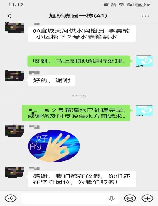 “感謝,我們都在放假,你們還堅守崗位,為我們服務(wù)!”10月5日11時08分,宜城市旭橋嘉園小區(qū)業(yè)主李女士在小區(qū)業(yè)主群里,向襄陽水務(wù)集團宜城天河供水有限公司網(wǎng)格員李昊楠發(fā)來感謝消息。而就在23分鐘前,她剛反映家中停水問題,現(xiàn)在水管故障已徹底解決,如此高效的服務(wù)響應(yīng)讓業(yè)主倍感貼心。